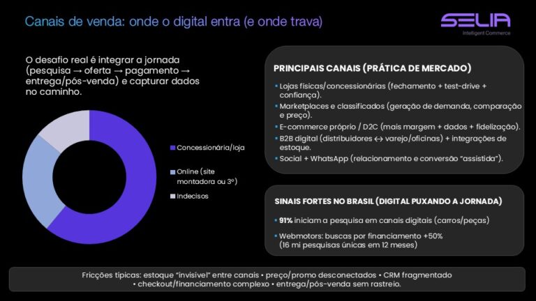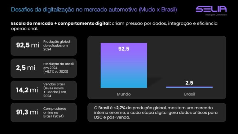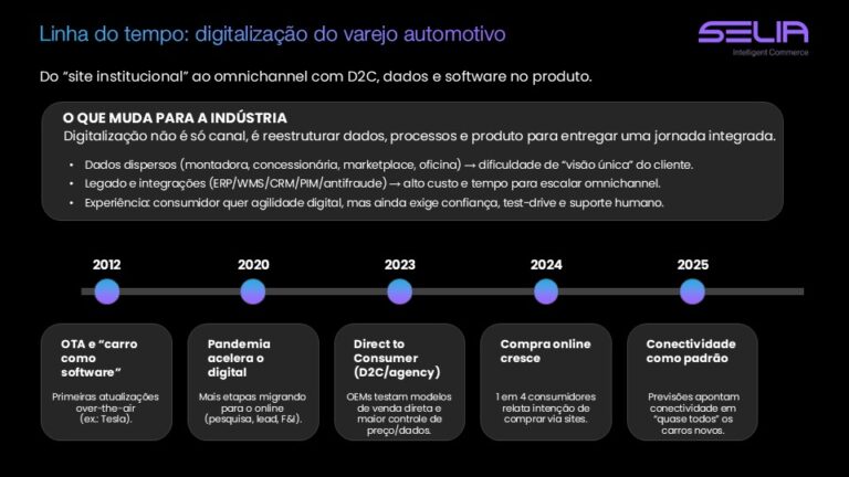 Este artigo analisa os principais desafios da digitalização no mercado automotivo brasileiro, a evolução dos canais, as fricções reais da jornada e o papel do Direct to Consumer (D2C) como estratégia central para o futuro do setor, com base no conteúdo apresentado pela Selia Intelligent Commerce no encontro com executivos do setor automotivo.